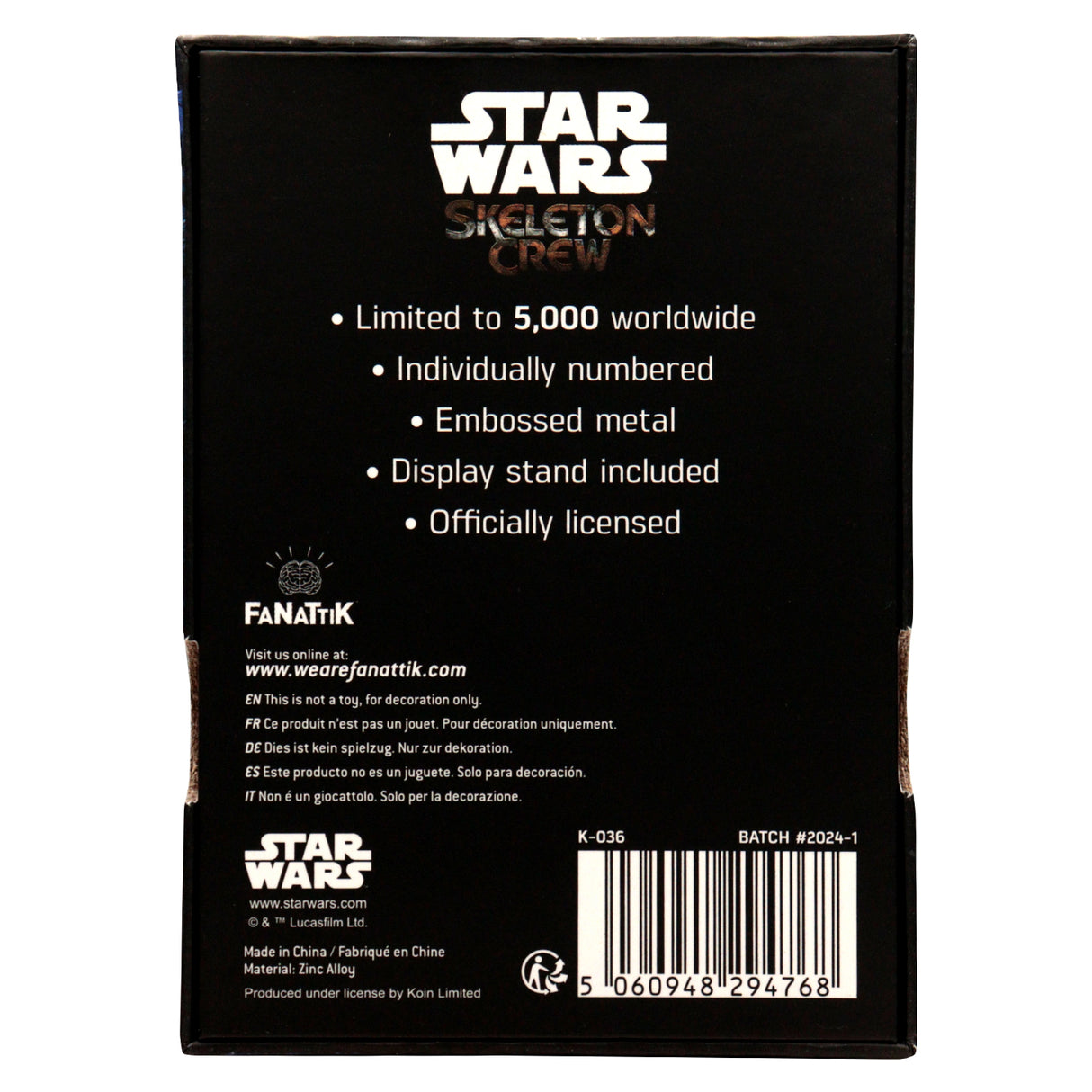 Join our youthful heroes on an epic quest to find home with Star Wars | Skeleton Crew Ingot. With a limited edition of only 5,000, this collectible ingot features an embossed double-sided design, individually numbered and showcasing key characters and the iconic logo. Display stand included in the presentation box. May the force be with you!