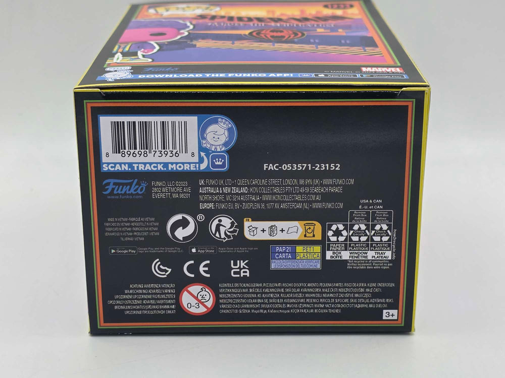 Bring the multiverse to your collection with this striking Miles Morales Funko Pop figure from the Spider-Man: Across the Spider-Verse film. Featuring an eye-catching blacklight design, this vinyl collectible captures the character's iconic look in vibrant detail. Standing at approximately 9 cm tall, it's the perfect size for display on shelves, desks, or alongside other Pop! figures. Housed in protective window box packaging, this #1233 Marvel collectible makes an excellent addition for fans of the franchise and Pop! enthusiasts alike.